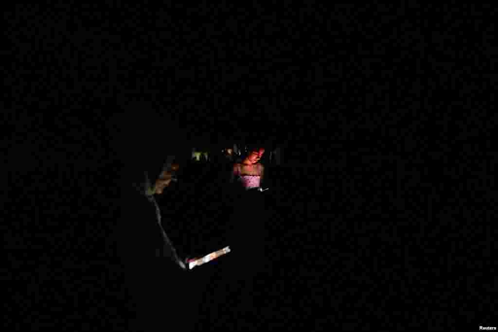 El pescador Yudel Ramos, de 30 años, utiliza una linterna frontal durante un apagón mientras sopla las brasas para calentar agua en una estufa de leña para bañarse, en Palpite, Ciénaga de Zapata, Cuba, el 7 de abril de 2026. REUTERS/Norlys Perez